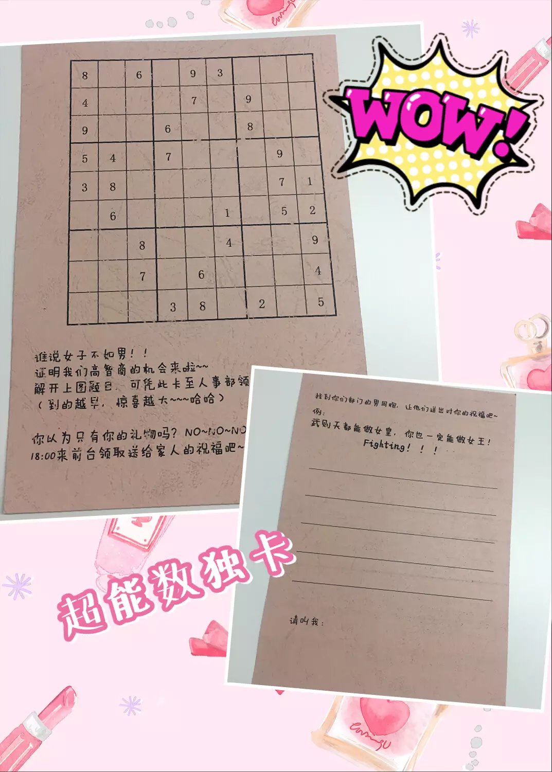 今天世紀陽天的男同胞也辛苦啦,不僅幫部門女王參考了數(shù)獨卡,還親手寫了祝福語。