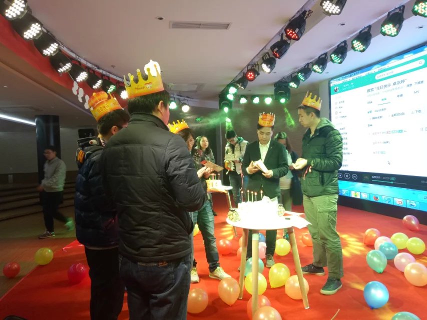 “祝你生日快樂……”這熟悉而美妙的音符悄悄響起,人事部妹紙手捧著生日蛋糕款款而來,將全場燈光熄滅,并點燃蠟燭,在生日歌的旋律中,幾位壽星們也許下了自己的生日愿望。除此之外,精美的生日禮物也送到了每一位壽星的手里,他們笑容洋溢,使整個房間都被愉悅與感動的心情包圍著。